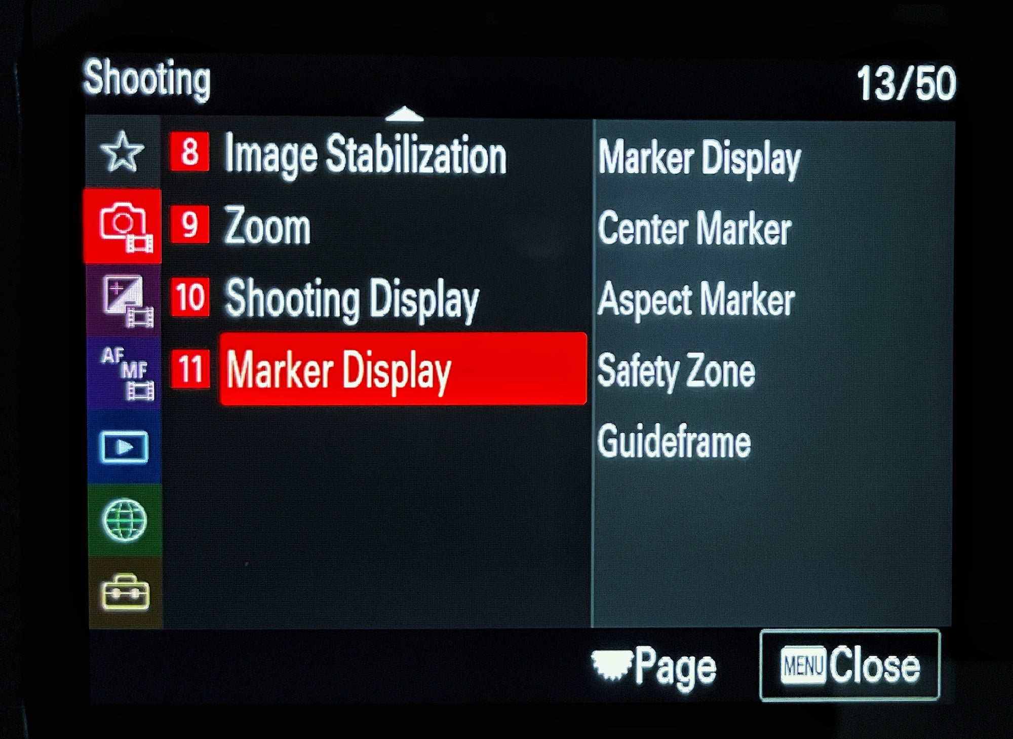 Otra configuración importante para D'Alia es el Marcador de Aspecto, dentro de la sección "Visualización de Marcadores" de su menú de ajustes. Esto mostrará líneas en la pantalla que te indicarán dónde se ubicará el fotograma de tu video. "Por ejemplo, grabo mucho en formato panorámico", explica D'Alia, "así que, en lugar del formato 16x9 habitual de la cámara, prefiero grabar en formato panorámico. Muestra barras negras arriba y abajo para darle un aspecto más cinematográfico. Se parecerá más a un formato cinematográfico, que suele ser 2:35:1, o a uno más comprimido y horizontal. Con el Marcador de Aspecto, puedo tener líneas blancas en la pantalla que me servirán de referencia para saber exactamente qué estoy grabando".
