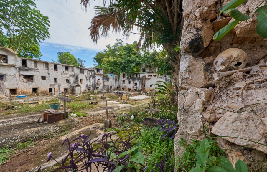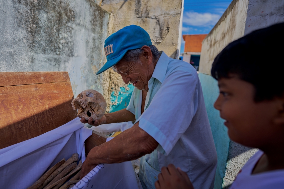 El panteón de Pomuch, en Campeche, es un espacio abierto, similar a muchos otros en México, pero con una particularidad que lo hace único: las urnas están descubiertas, permitiendo ver los restos de quienes allí descansan. Las familias no solo limpian las tumbas de sus ancestros; con un respeto profundo, retiran el polvo de los huesos, que luego envuelven en textiles bordados, ofrendas que simbolizan un amor eterno. Mi acercamiento fue directo y respetuoso: mientras realizaban el ritual de limpieza, les pregunté si podía documentar ese momento. La mayoría de ellos accedió, lo que me permitió no solo fotografiar, sino también aprender y comprender más sobre esta tradición y sus historias familiares.