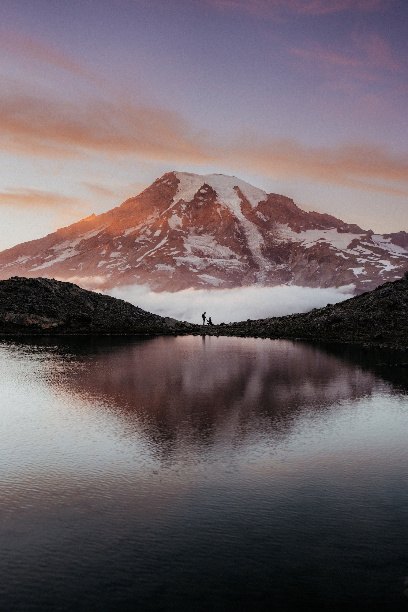 “Me encanta esta imagen porque no sabíamos si iba a salir bien. El monte Rainier estuvo oculto tras espesas nubes todo el día y, de alguna manera, apareció justo cuando el cielo cambió de color durante el atardecer. Me encanta cómo la nube seguía baja y ayudó a que Joe y Pat resaltaran en el fondo. En cierto modo, fue mejor de lo que esperábamos, pero todo salió bien gracias a la confianza que mis clientes depositaron en mí. Seguí adelante con el plan incluso cuando a veces parecía inalcanzable”.