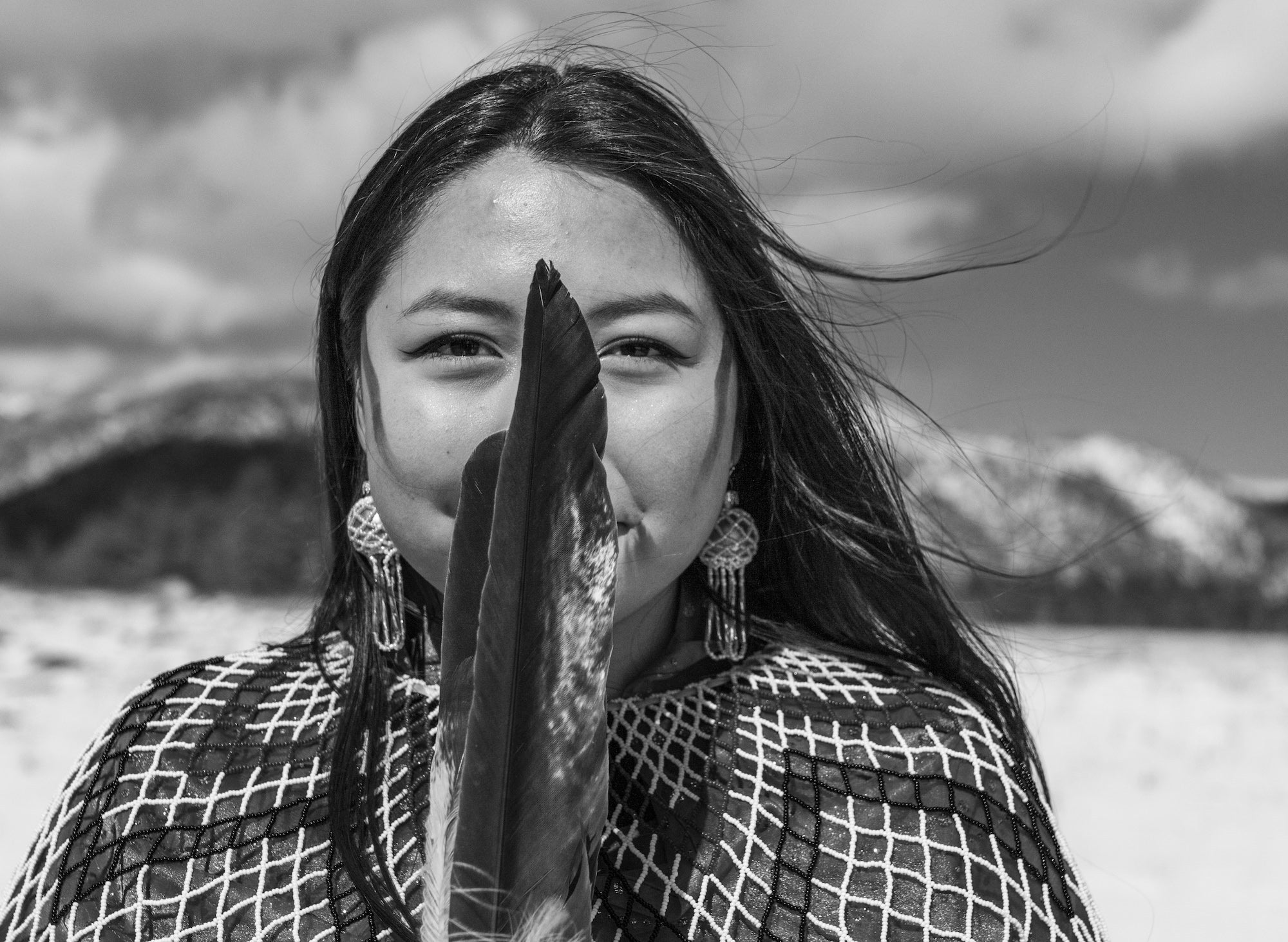 "Pasé la mañana entrevistando a Maya Tilousi Lyttle y a su madre Carletta sobre su trabajo como activistas indígenas que luchan por la protección de la tierra y el agua. Al final de la sesión, como teníamos las manos congeladas, hice que Maya se pusiera de pie, sosteniendo la pluma que había llevado en el pelo para la entrevista. Mientras estábamos bajo los picos de San Francisco en Flagstaff, Arizona, un lugar sagrado para la tribu maya Havasupai, creo que la mañana fría y larga hizo que aflorara su fuerza y resiliencia en su expresión. Solo duró unos momentos, pero sentí que era capaz de capturar el coraje dentro de esta joven extraordinaria".