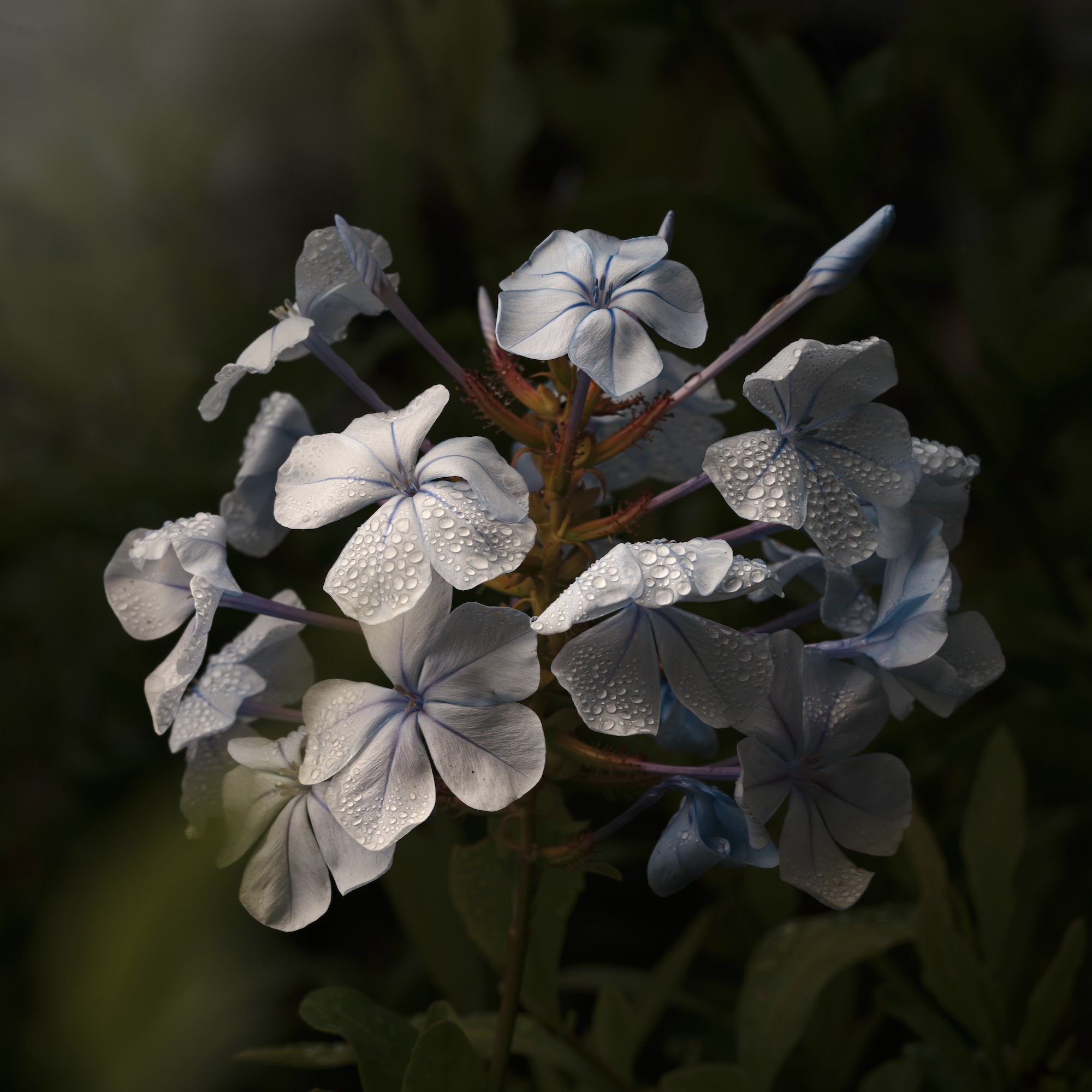 "Esta foto fue tomada en Kando, Santa Bárbara, California. ¡Me encanta que la hayan tomado justo al lado de la estación para que las mascotas hagan sus necesidades afuera del hotel! Me encanta tomar imágenes de bellas artes en todas partes y estas pequeñas plumbagoas estaban rociadas con un poco de lluvia. Esto demuestra que el arte está en todas partes y que solo se necesita una lente macro para encontrarlo".