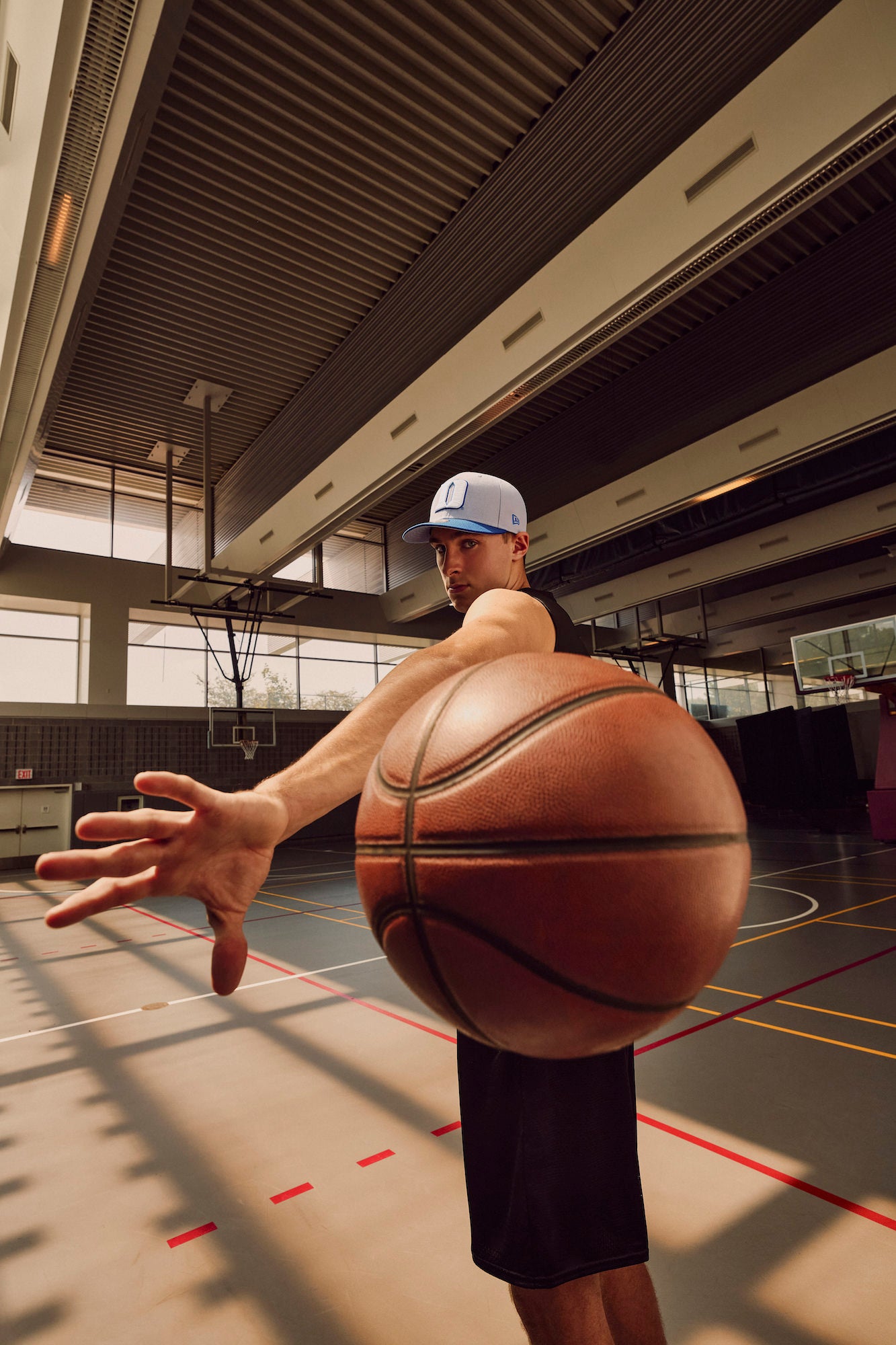 “Para esta sesión, teníamos unos 10 minutos con Cooper Flagg. Fue un día extremadamente largo en el que la campaña dividió su tiempo entre largas horas de videografía y pequeños períodos de tiempo de fotografía en el medio, por lo que teníamos que ser rápidos, impactantes y acordes a la marca. Inmediatamente recurrí a uno de mis trucos de fotografía que sé que funcionaría. El objetivo era hacer que la audiencia fuera parte de la imagen y lanzar la pelota al aire entre Cooper y la cámara, creando una conexión inmediata entre el talento y la audiencia a través de ese falso "pase" mientras miraba a la cámara. Contamos 3, 2, 1 y *clic* ¡ahí estaba!”