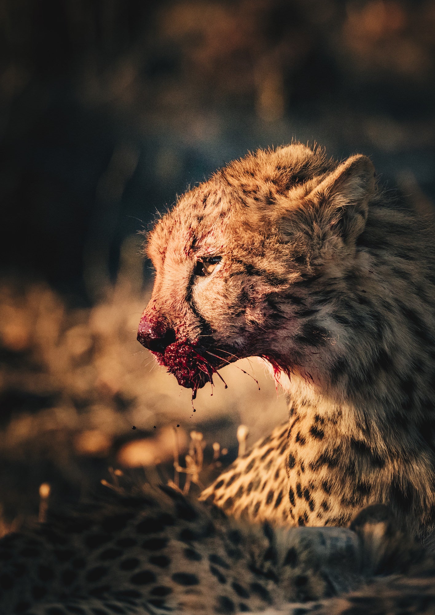 “En la oscuridad de la mañana, salimos del campamento hacia el bosque en vehículos. Una vez que nos adentramos lo suficiente, nos pusimos en camino a pie bajo la luz del sol con el equipo de la reserva de caza de Dinokeng. Después de un rato, llegó el momento. Una manada de impalas chilló en voz alta, redirigiendo nuestra atención. Ahora, en el vehículo por seguridad debido a la defensa de una posible presa, vi a un guepardo jadeando. Era una madre joven que había matado a un animal. Llamó a sus crías para que se unieran a ella. Con la respiración agitada, caminó y llamó. Y luego una procesión de 6 guepardos jóvenes se dirigió hacia ella. Y ella los acompañó hasta la presa. Capté esto cuando uno de ellos levantó la cabeza”.